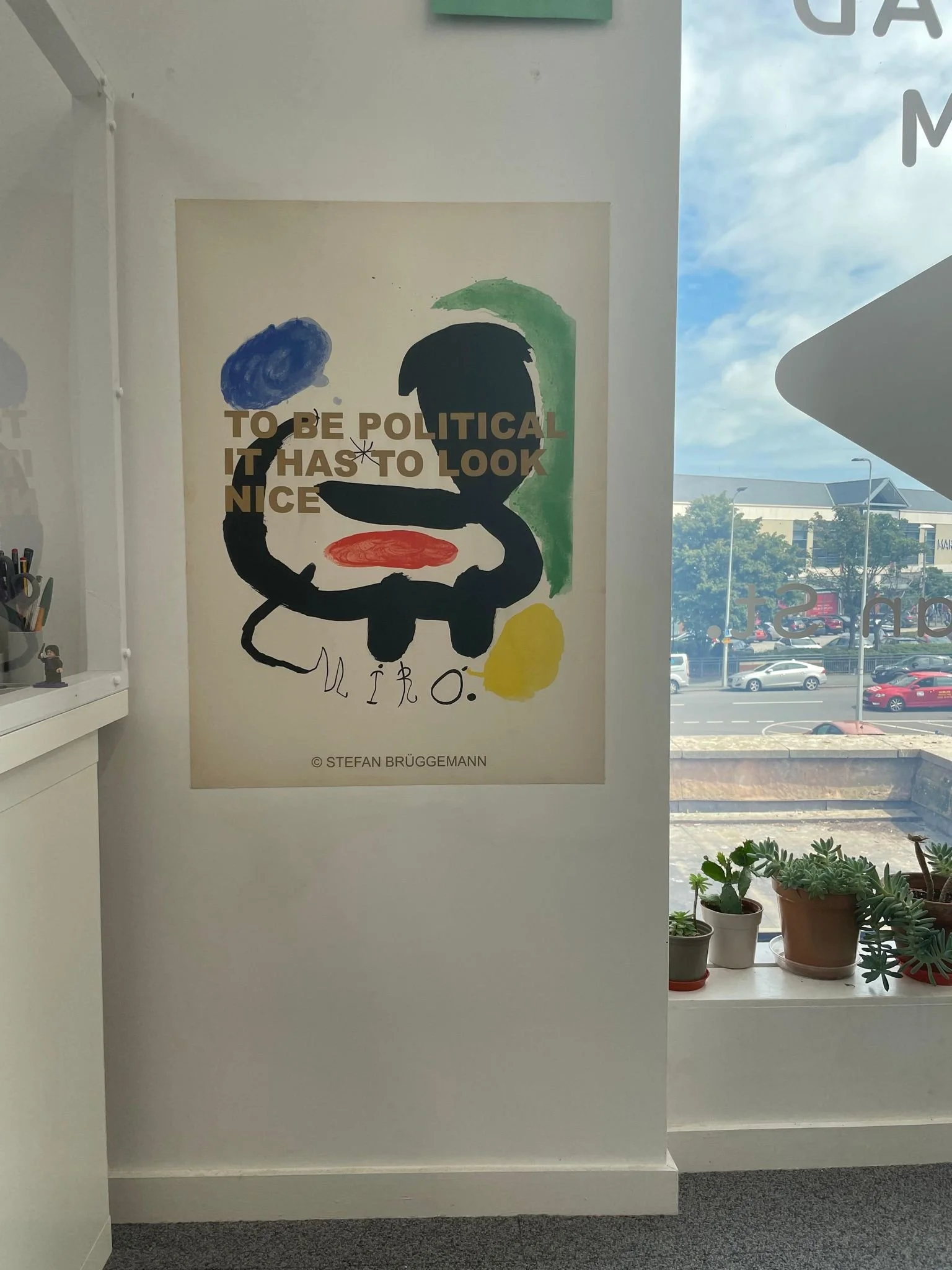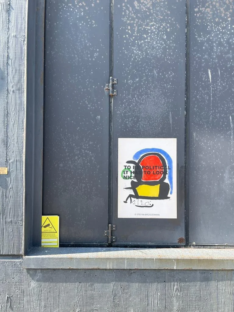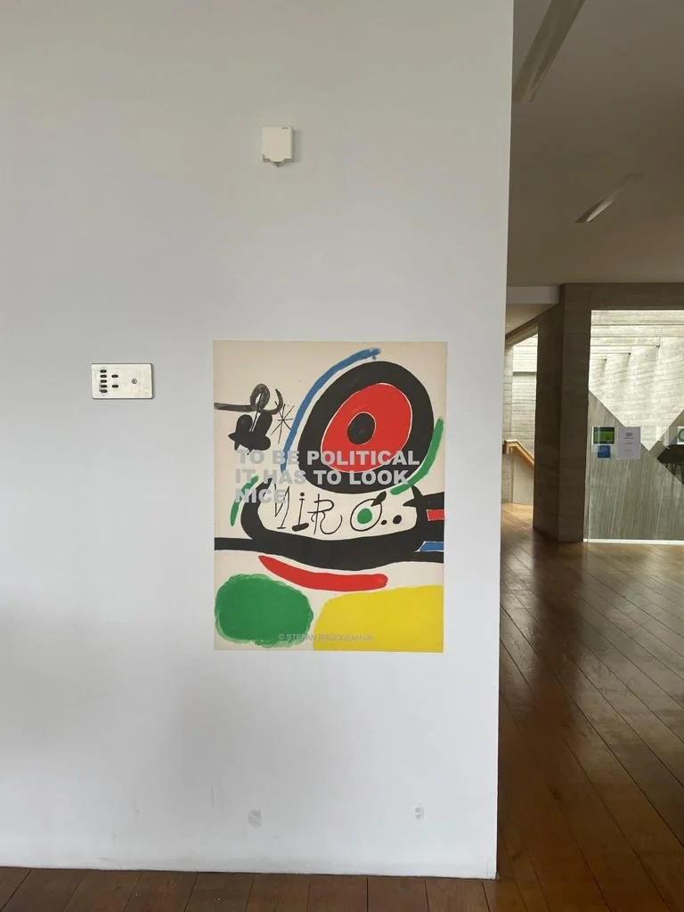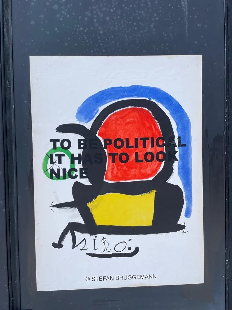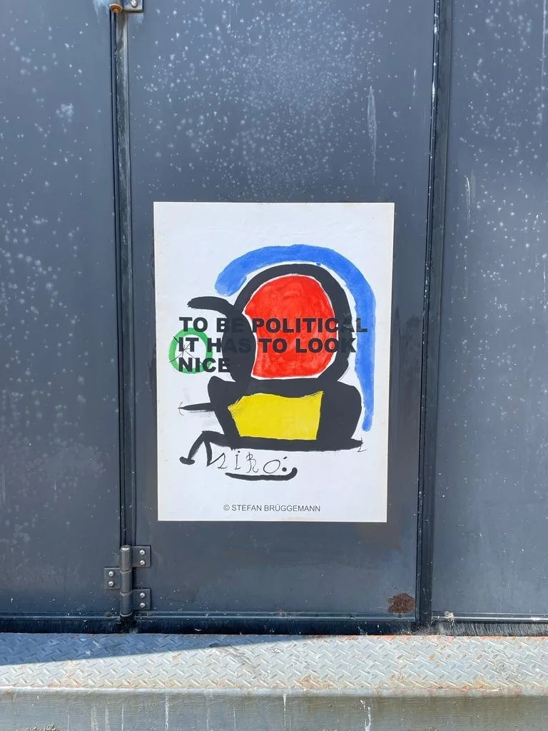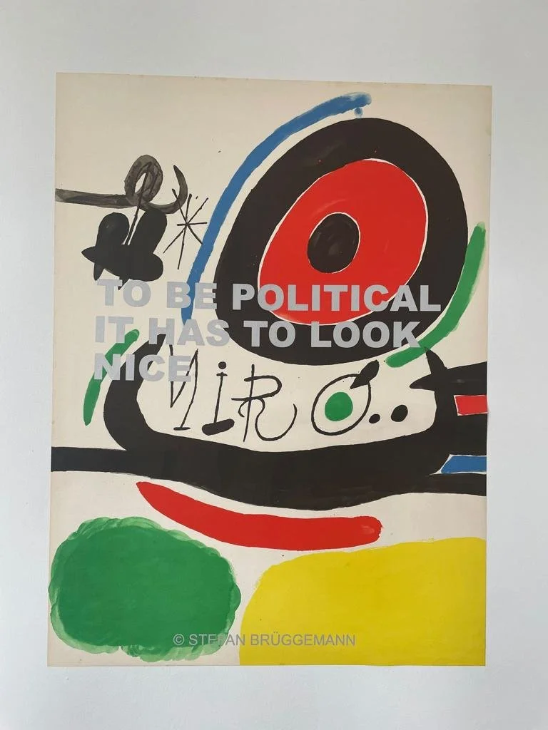 In his latest project, Brüggemann/Miró, he has reused a series of lithographic posters by Joan Miró, on which he has printed one of his most iconic poems: "To Be Political, It Has To Look Nice”. These works raise several questions, some obvious at first glance, such as the relationship between politics and aesthetics, the influence of politics on art, or the use of art as propaganda. Others, less obvious, emerge as the viewer becomes immersed in the work, such as the reuse of resources as opposed to overproduction, the overexposure to messages in capitalist societies, or the role of propaganda in contemporary art. Brüggemann will stick these posters on the street in the manner of political propaganda. The fact that the work is transferred to the street completes its meaning, as it surprises the viewer in a context completely different from the usual exhibition spaces, giving it a new dimension both aesthetically and conceptually.